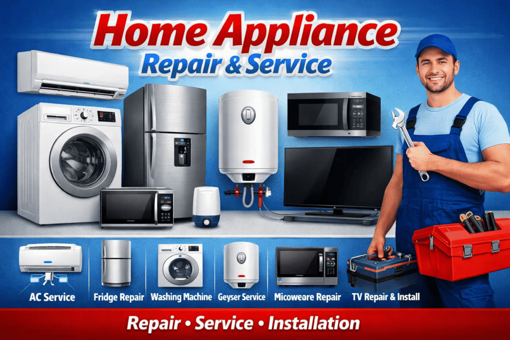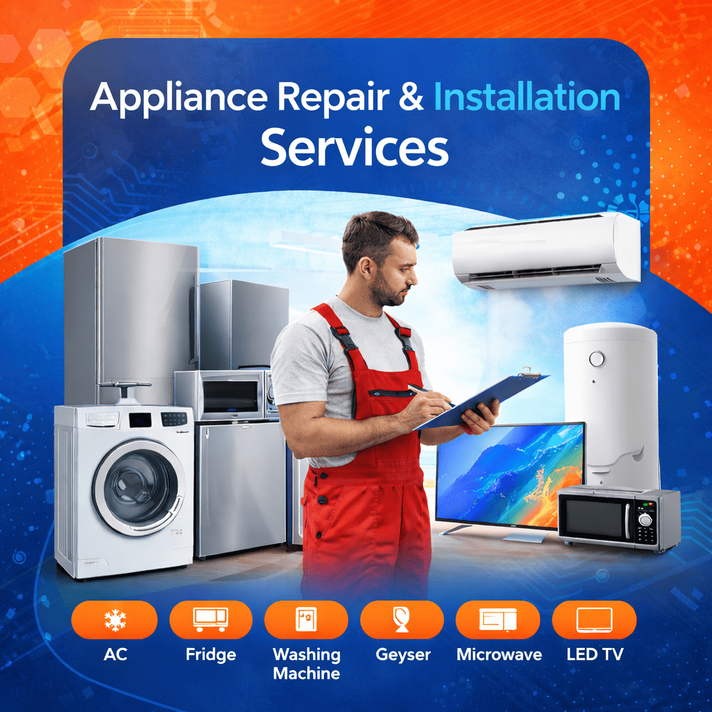 Get expert repair and installation services for AC, fridge, washing machine, geyser, microwave, and TV. Same-day service with skilled technicians and guaranteed satisfaction.